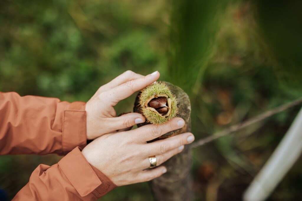 Ihr erstes Lieblingsprodukt wächst nicht von heute auf morgen. Die Edelkastanie. Vor acht Jahren als naturnahe Streuobstplantage gepflanzt sind die ersten Früchte jetzt sichtbar. Bäume, die sie einzeln umsorgen, um sie nicht an den problematischen Kastanienrindenkrebs zu verlieren. Aber auch hier forschen sie unter wissenschaftlicher Begleitung in einem landwirtschaftlichen Innovationsprojekt an einer biologischen Lösung. Landwirtschaft, die Zeit braucht und genau darin ihren Wert hat.
